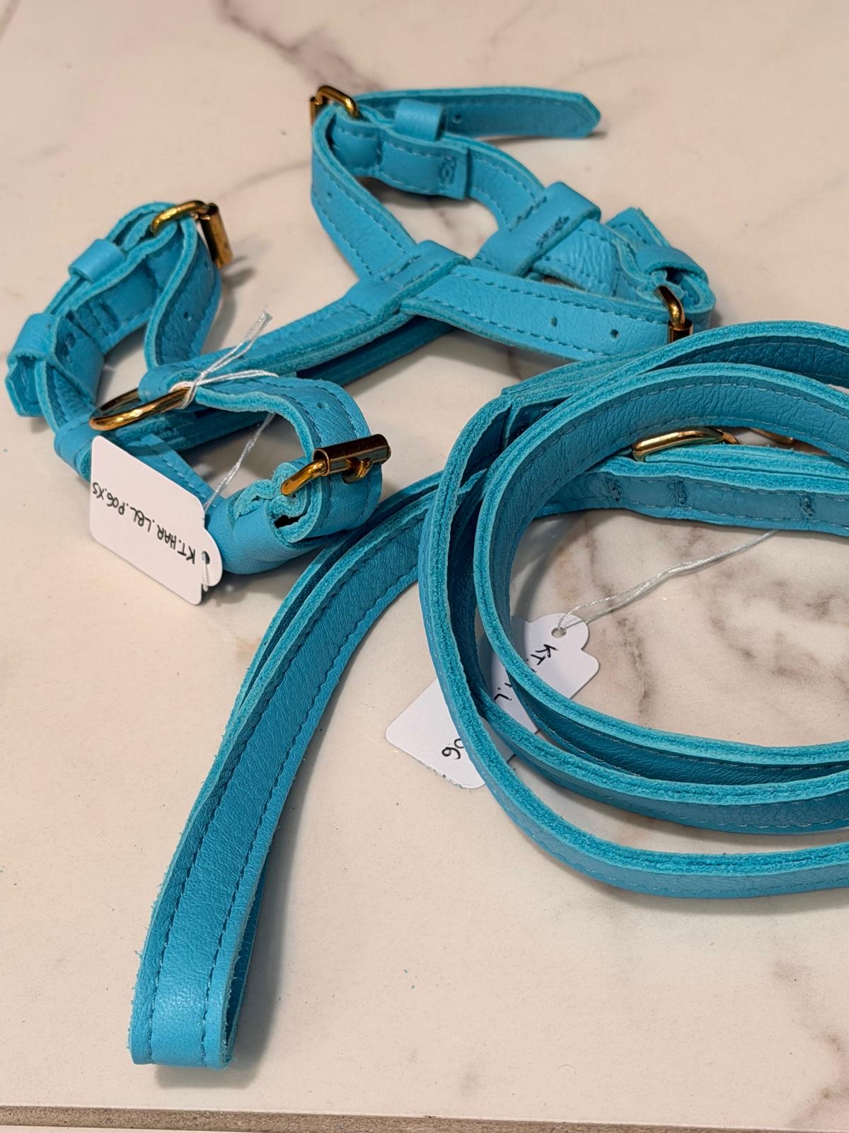 Pettorina azzurra in pelle leggera con guinzaglio abbinato.