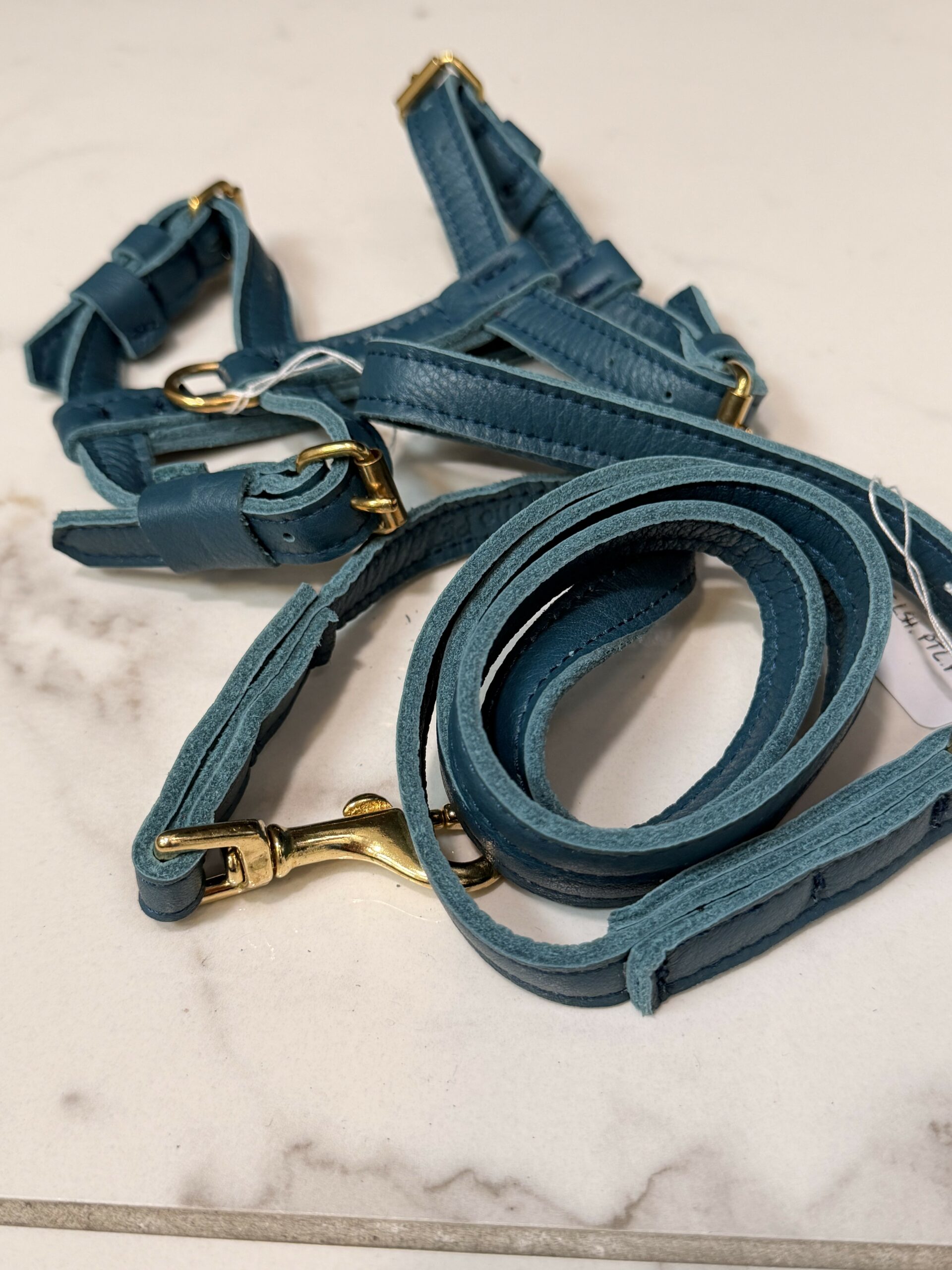 Pettorina petrolio in pelle leggera con guinzaglio abbinato.